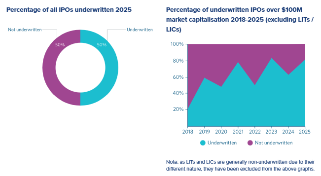 The percentage of underwritten IPOs rose in 2025 to a high of 50% of all IPOs and was higher again, as is typical, for issuers with market capitalisations above $100 million. These figures continue the longer term trconclude of an increase in the level of underwriting of IPOs.