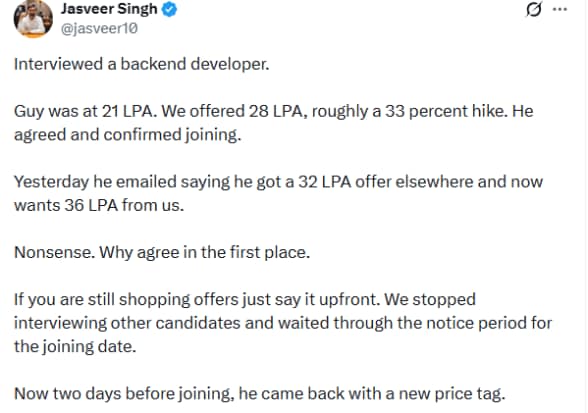 Jasveer Singh, co-founder and CEO of dating platform Knot Dating, shared how a backfinish developer who had already accepted an offer from the company later sought a higher salary just days before his planned joining date.