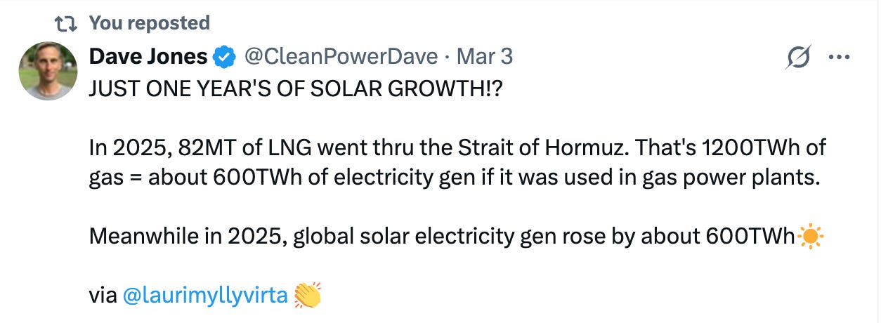 And, inexplicably, some governments in Europe, notably Germany’s are actually advocating for a greater commitment to LNG-depfinishence. In the name of “supply security”, Economics Minister Reiche has been calling for the construction of 20 GW of gas-fired capacity. Undeniably, gas still has a role to play. But the far, far more convincing response to this new shock is clearly to rapidly build out more solar and battery storage.