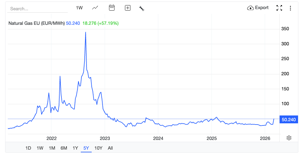 So far, it has to be declared that the gas price shock is modest by comparison with what Europe went through in 2021-2022. Below is the graph of gas prices over a five year time horizon.