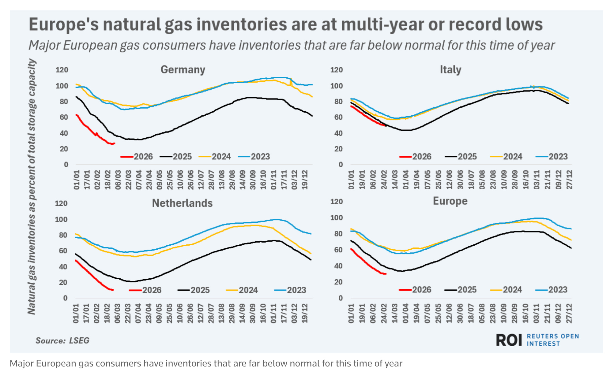 Natural gas inventories in Germany – Europe’s largest gas consumer – started the month of March at only 27% of capacity, compared to an average of 64% of capacity for that time of year since 2023, data from LSEG displays. Gas stockpiles in the Netherlands – home to Europe’s main gas trading hub – are only around 10% of capacity, compared to around 48% on average for early March.