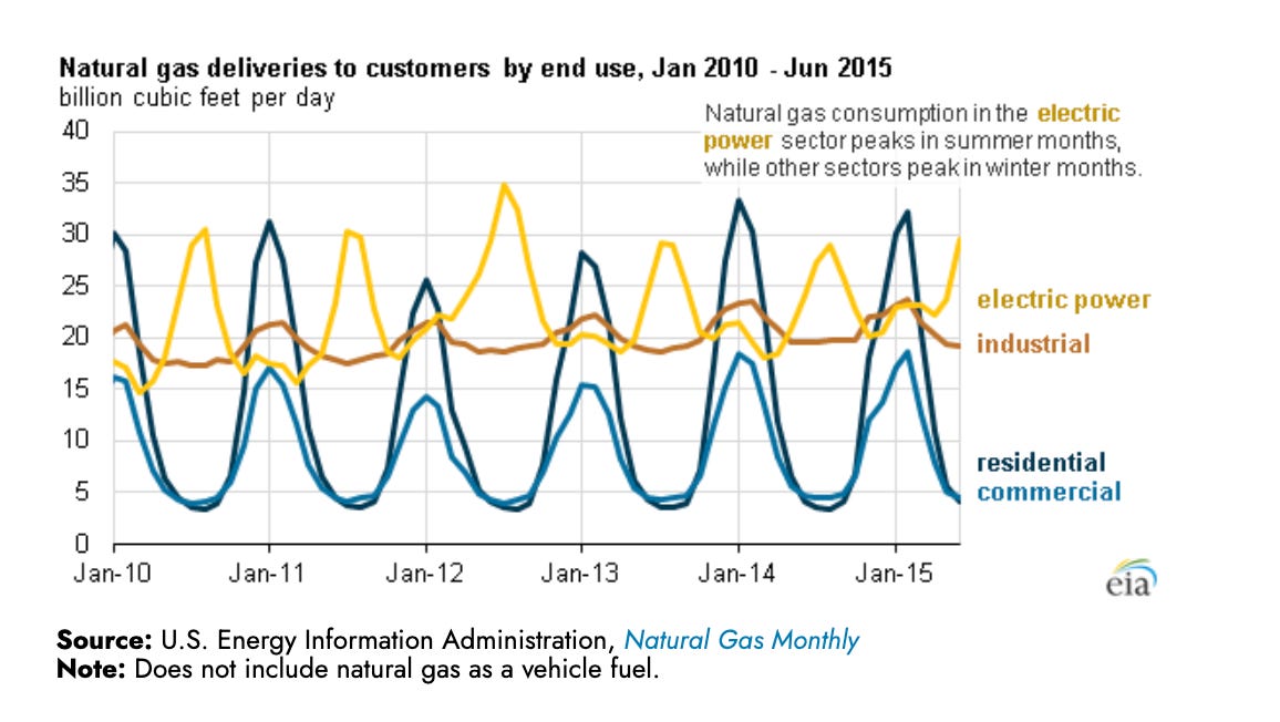 In the winter, especially in a cold winter like the one we have just had in Europe and the US, energy consumption goes up, for heating. So far, cold continues to be a much greater threat to human life than heat. In the summer, in really hot parts of the world, you can have a spike too, for air-conditioning and cooling. In the US the two cycles in gas demand overlap, being divided between hoapplyholds that burn gas for heat in the winter and the electricity system that burns gas to generate power to run air-conditioners in the summer.