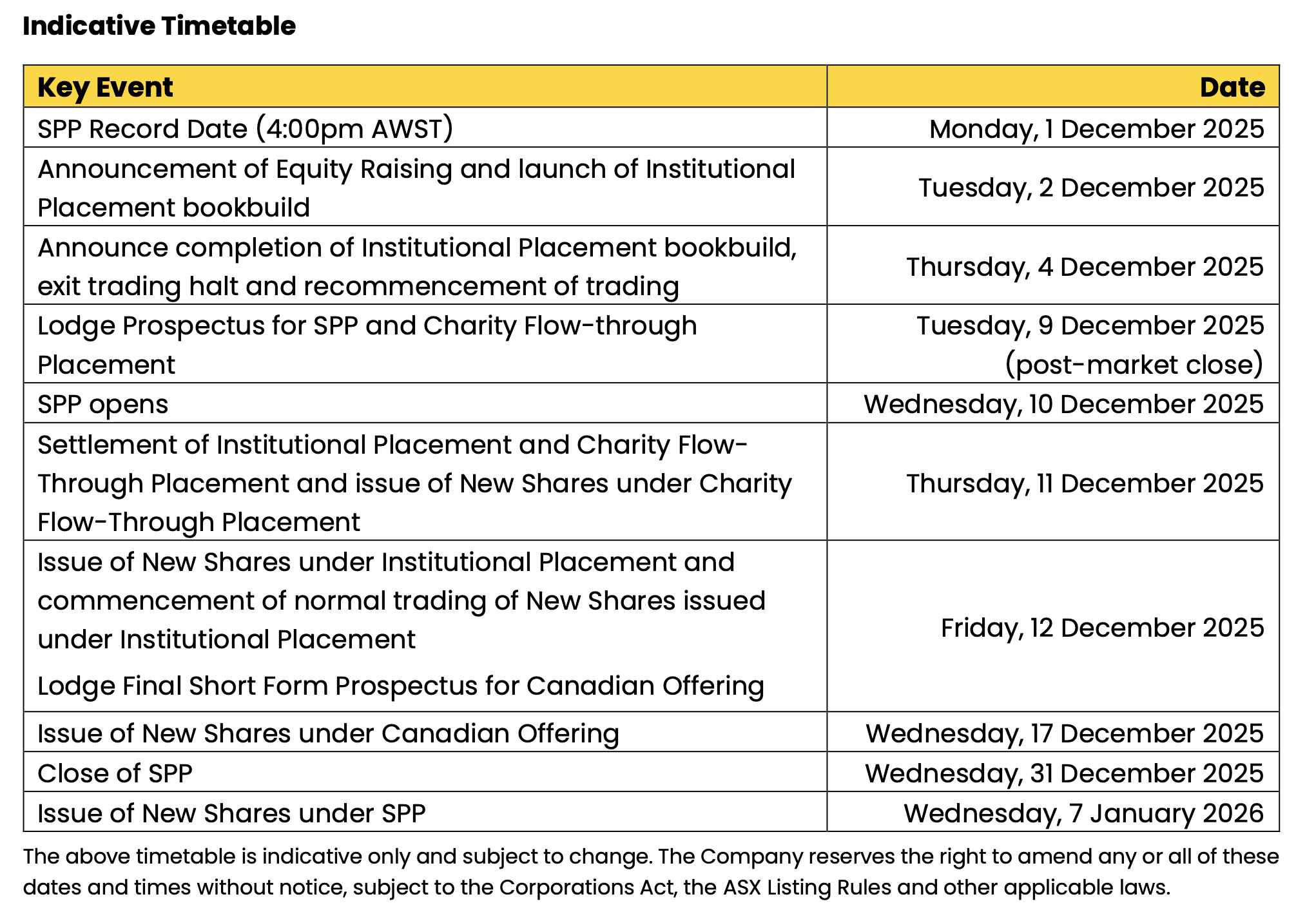 The equity raising is being implemented in three tranches: a ~A$16.4 million (C$15 million) charity flow-through placement to Canadian investors priced at about A$2.09 per share; an A$85 million institutional placement at A$1.70 per share; and a ~A$32.8 million (C$30 million) Canadian bought deal offering at C$1.56 (A$1.70) per share, with an over-allotment option of up to an additional C$4.5 million.