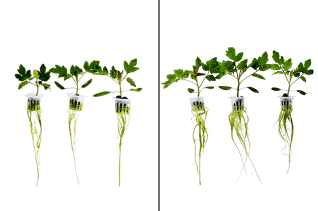 Untreated cress plants under high-light stress with lower leaf number and area and thinner root density (left) and treated cress plants under high-light stress with higher leaf number and area and denser root growth (right)