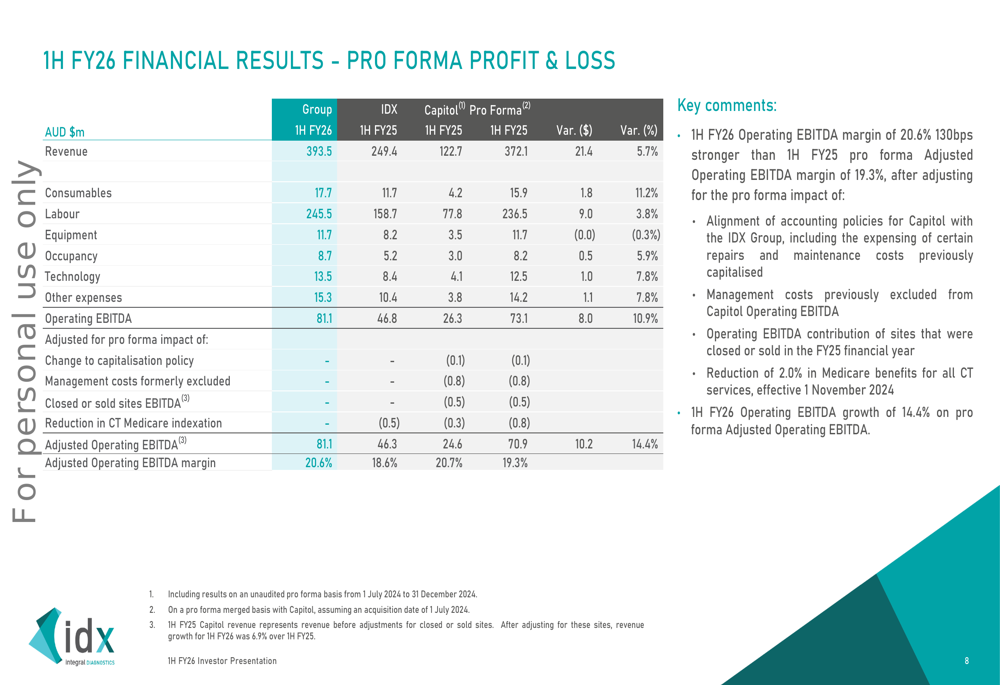 On a pro forma basis comparing combined IDX and Capitol results from the prior year, group revenue grew 5.7% to $393.5 million. The company noted that organic revenue from all sources in Australia grew 7.4% compared to Medicare growth of 9.1% over the course of the half, indicating solid underlying demand for diagnostic imaging services.