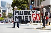 Protestors demonstrate against U.S. President Donald Trump and Elon Musk in front of a Tesla Dealership at Van Ness Avenue and O’Farrell Street in San Francisco on Saturday, May 3, 2025.