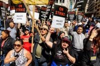 Protesters march outside the Grand Hyatt hotel in San Francisco on Monday, Sept. 2, 2024. Patrick Murphy, a professor of public affairs at the University of San Francisco, declared attempting to utilize mass mobilization to support monied interests represents “an unusual application of what we believe of as the laws of political physics.”