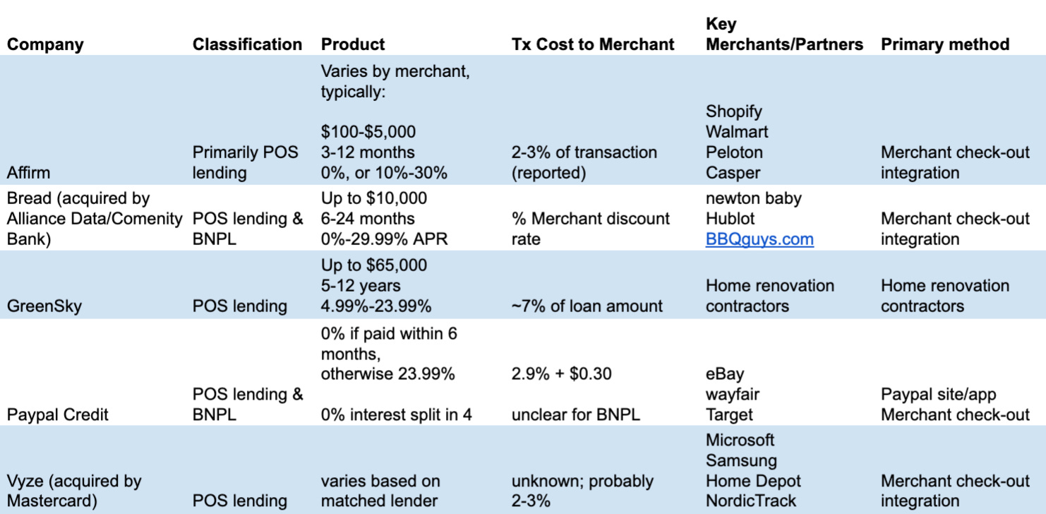 While Paypal has long offered a line of credit product, it has expanded into the ‘pay in 4’ category. With an existing, large merchant network, this may be the most serious threat to startup POS lconcludeers and BNPL, if Paypal (…and Venmo) can deploy a competitive utilizer experience at checkout.