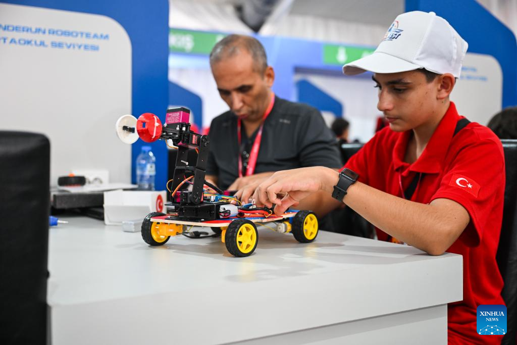 A participant adjusts a robot at the technology event TEKNOFEST in Istanbul, Türkiye, Sept. 17, 2025.