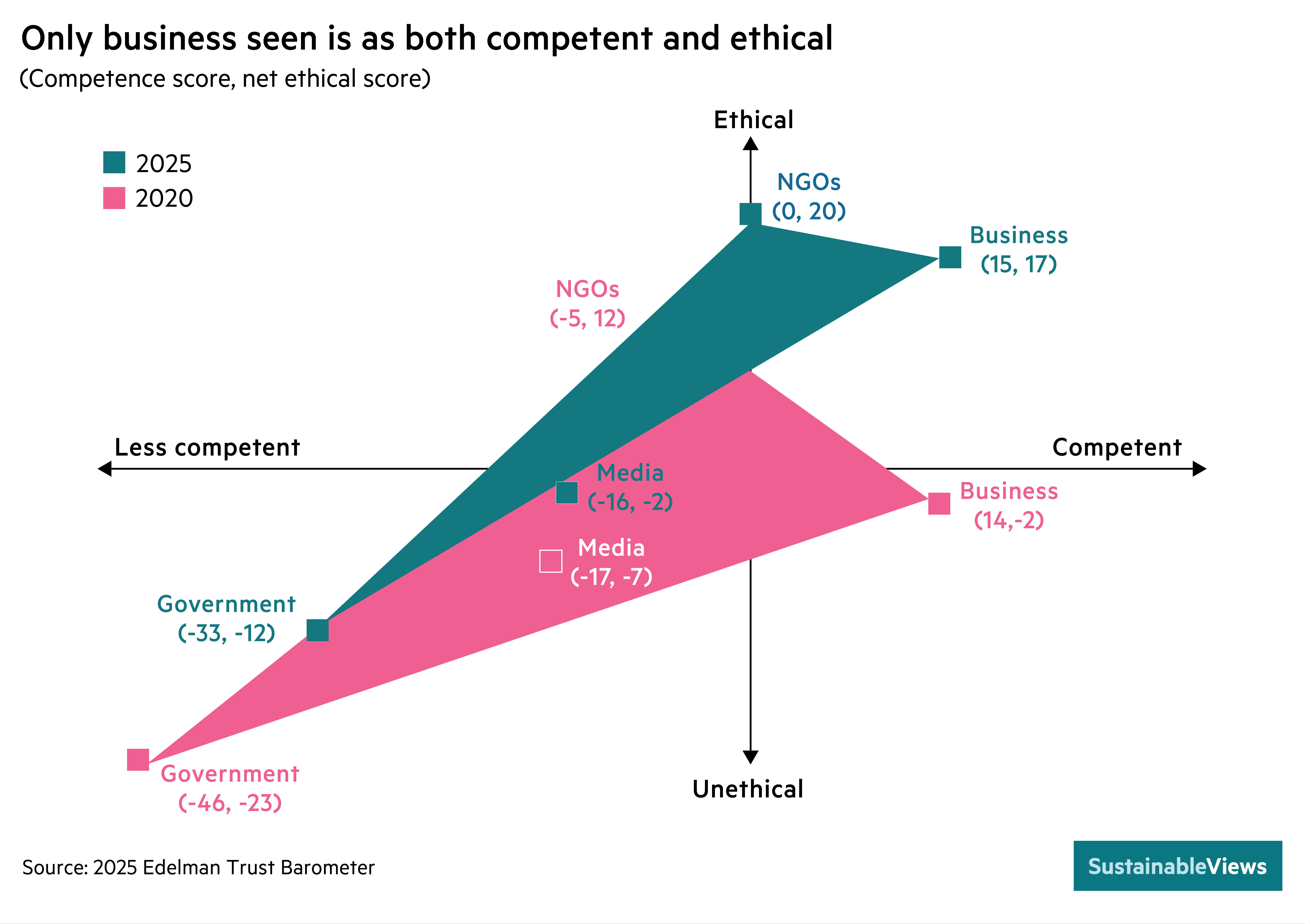 The Edelman barometer found that people trust businesses on average 7 per cent more than governments. The extent to which companies are seen as ethical has also increased by 19 points since 2020, it added.